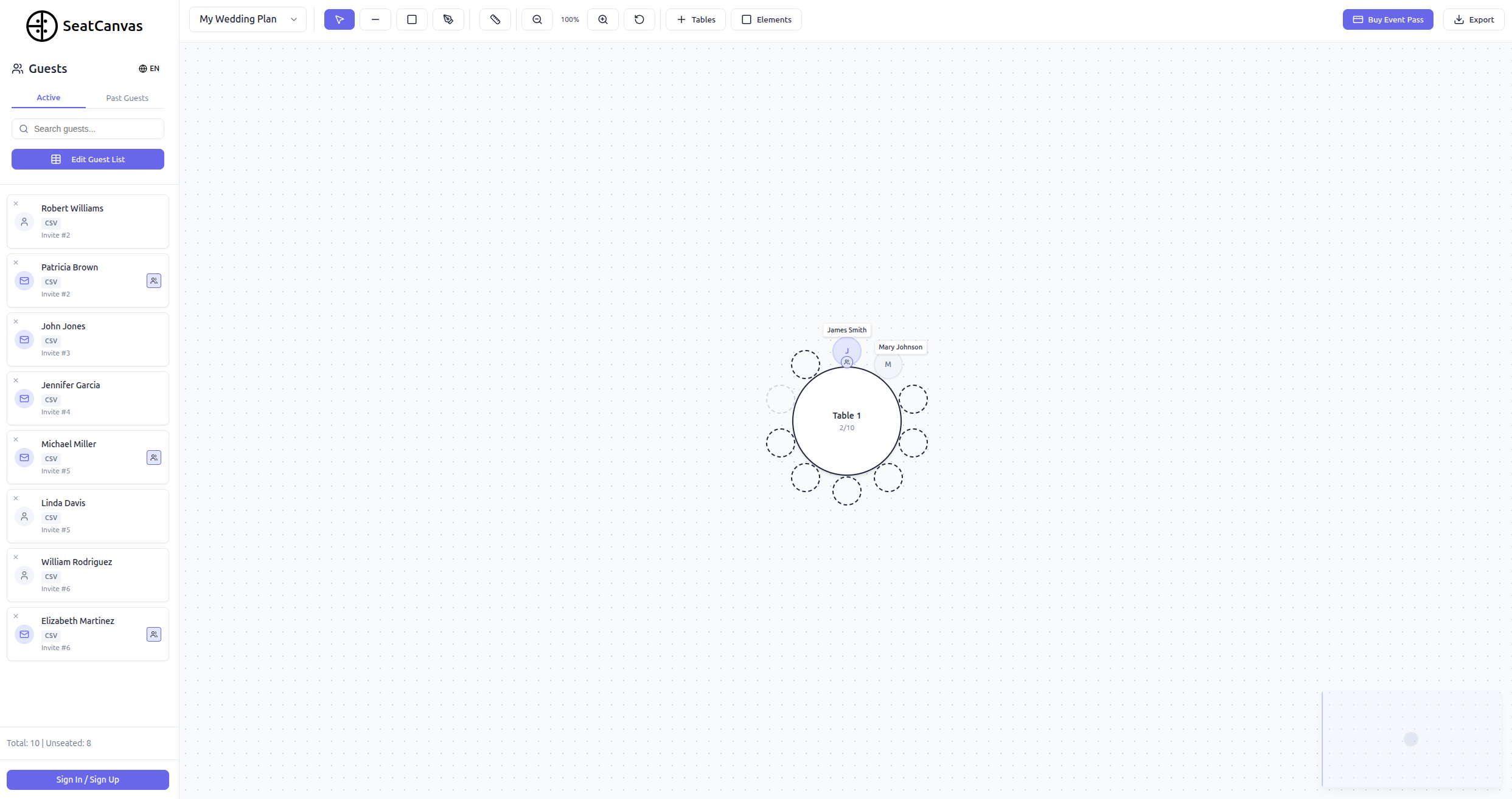 Planning wedding seating is chaotic. Spreadsheets get messy, last-minute changes create stress, and visualizing the room is hard. SeatCanvas is a drag-and-drop seating chart and floor plan tool built specifically for weddings and events. Add tables, import guest lists, assign seats visually, and export polished PDFs for vendors. Start free, upgrade with a one-time Event Pass.